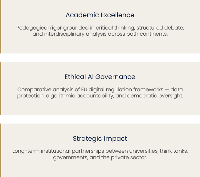 We foster excellence in education, rigorous analysis, responsible innovation, and the ethical governance of artificial intelligence to create sustainable impact on decisions and international partnerships.