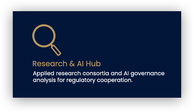 Applied research consortia for EU-funded projects and a dedicated AI Hub analyzing the impact of artificial intelligence on global governance and regulatory cooperation.
