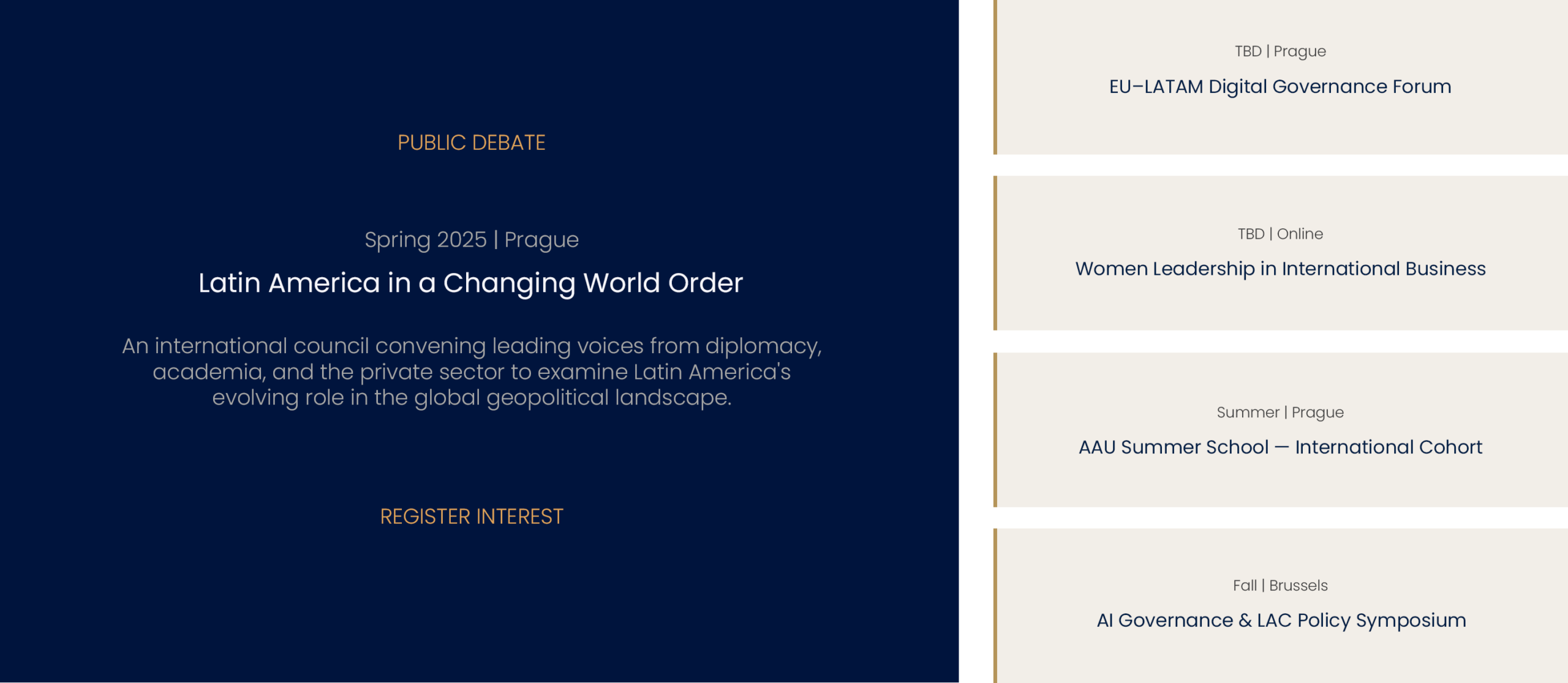 Based at Anglo-American University in Prague — the Czech Republic’s most international university — we generate sustainable impact on international trajectories, business alliances, and geopolitical decisions.